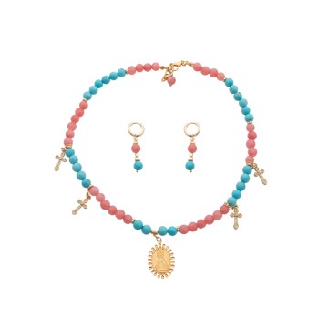 Hermoso collar en bronce, un diseño juvenil, elaborado con piedras de colores, adornado con dijes y viene acompañado de aretes.