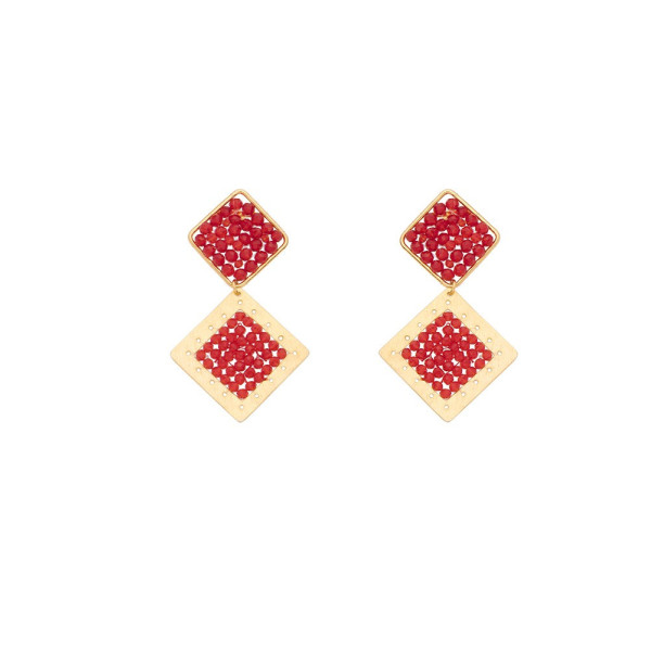 Preciosos aretes en bronce, con baño en oro de 24 kilates. Diseño novedoso en forma de doble rombo, adornados con tejido de cristales rojos.