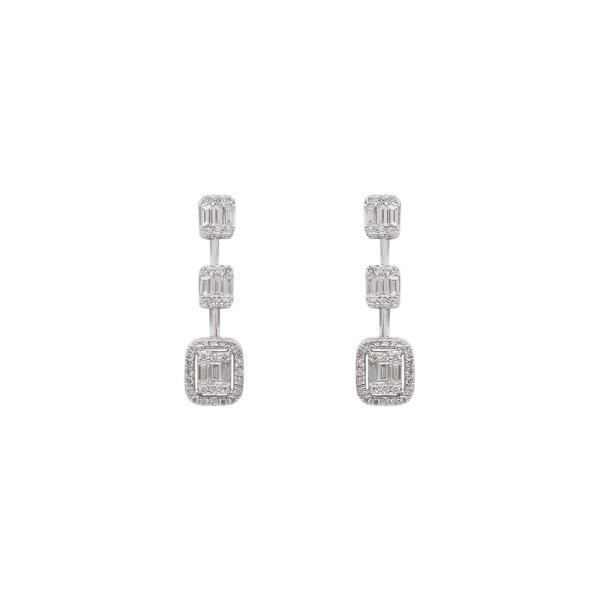 Estos aretes rectangulares, elaborados en oro blanco de 18K y adornados con diamantes, reflejan la esencia del lujo moderno. Su diseño geométrico y elegante los convierte en el complemento ideal para realzar cualquier look con brillo sutil y distinción eterna. Perfectos para quienes valoran la elegancia sin exceso.
