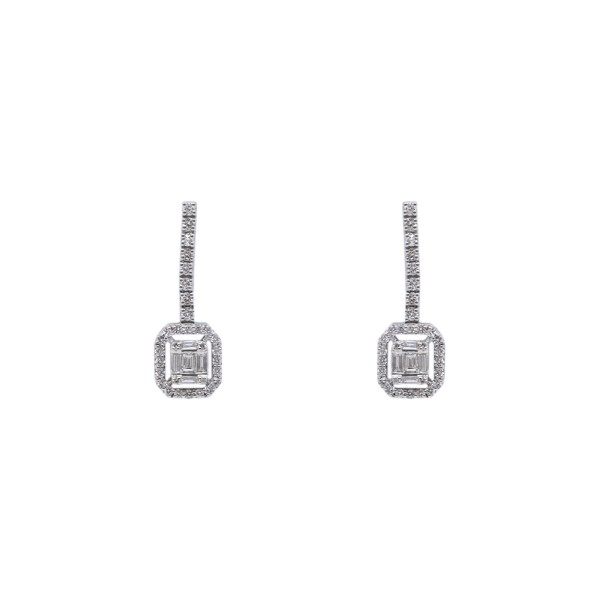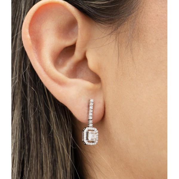 Estos aretes rectangulares, elaborados en oro blanco de 18K y adornados con diamantes, reflejan la esencia del lujo moderno. Su diseño geométrico y elegante los convierte en el complemento ideal para realzar cualquier look con brillo sutil y distinción eterna. Perfectos para quienes valoran la elegancia sin exceso.