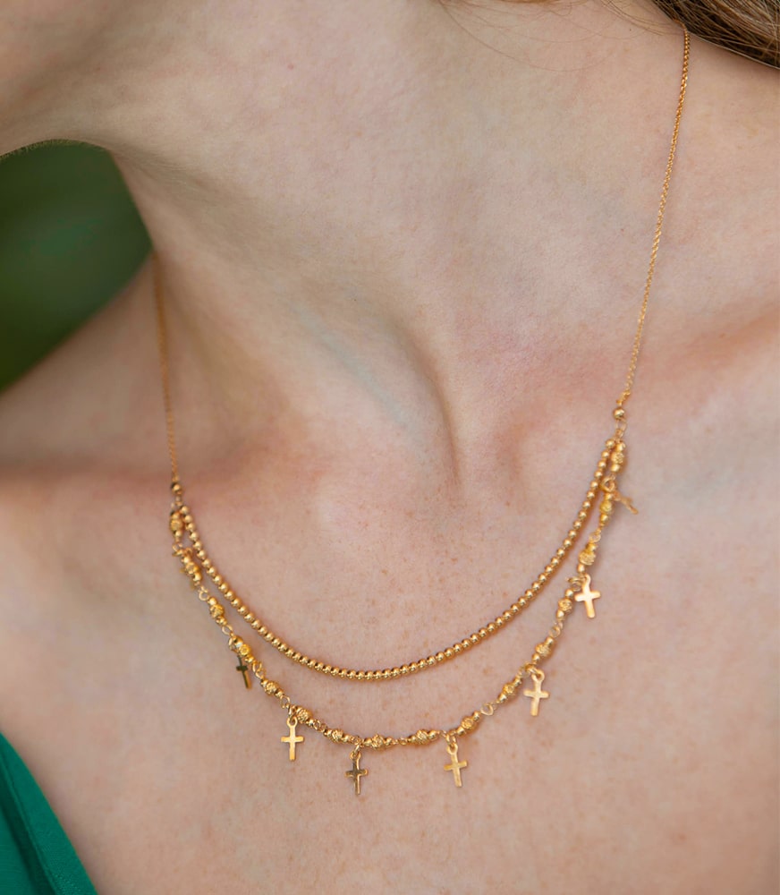 ● Uno de los grandes protagonistas de la moda actual es el uso de collares en capas. Este estilo permite jugar con diferentes longitudes y diseños, combinando collares más finos con otros más llamativos. En Platería Ramírez, ofrecemos opciones en plata que permiten a cada mujer crear su propio estilo, ajustando la cantidad de capas según la ocasión.