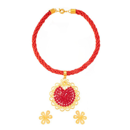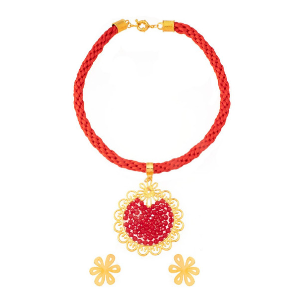 Collar en bronce con baño de 24k. Diseño con tejido en cordón trenzado, adornado con un dije circular que en su interior tiene piedras de obalorio, incluye aretes en forma de flor.