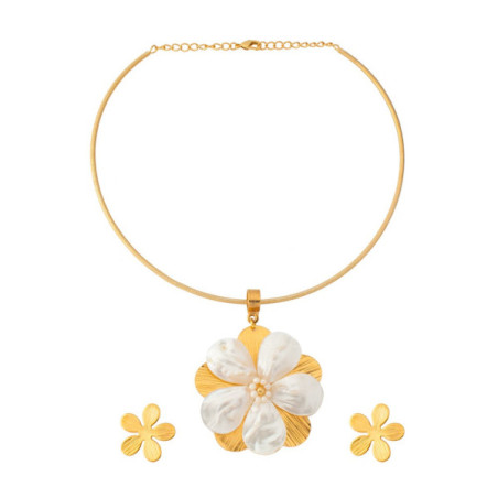 Collar en bronce con baño de oro de 24 quilates. Diseño moderno y sofisticado que se encuentra adornado con un dije en forma de flor que tiene perlas en su interior.
