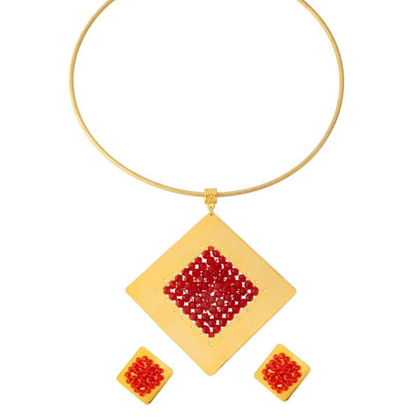 Collar en bronce con baño de oro de 24 quilates. Diseño novedoso acompañado con dije en forma rombo liso, adornado con cristales de abalorio rojos en su interior y aretes.