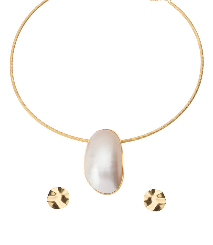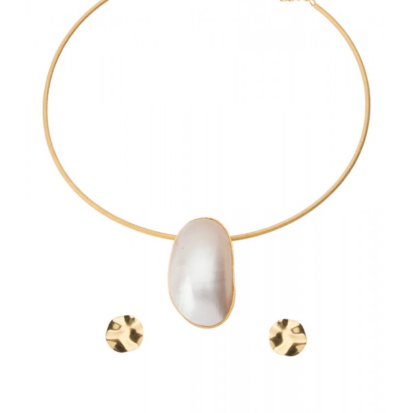 Hermoso aro en fantasía fina. Diseño elegante, adornado con perla concha. Viene acompañado con aretes tipo martillado
