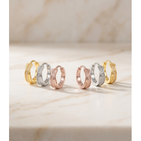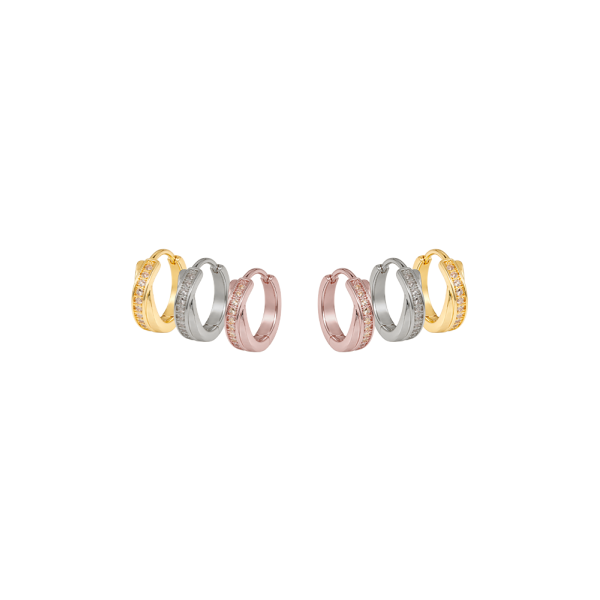 Eleva tu estilo con este exclusivo set de tres candongas en bronce, cuidadosamente diseñadas con un elegante efecto cruzado y delicados aros en acabado tricolor. Su combinación de tonos aporta un brillo sutil y contemporáneo que se adapta con naturalidad a cualquier ocasión, desde looks cotidianos hasta momentos especiales.