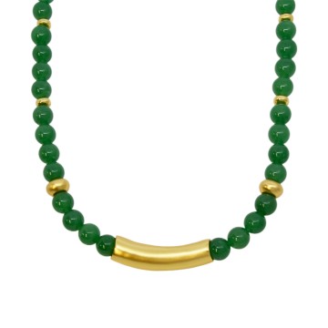 Este collar precolombino combina la fuerza de la tradición ancestral con un diseño contemporáneo y refinado. Está elaborado con herrajes en aleación de metales bañados en oro de 24 quilates y ágatas verdes semipreciosas de 10 mm, que aportan equilibrio, frescura y un toque de distinción natural.