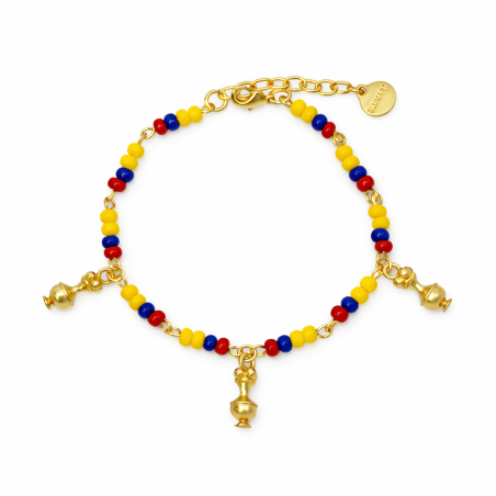 Esta pulsera precolombina es un homenaje a la identidad y riqueza cultural de Colombia. Elaborada con chaquiras checas en los colores representativos de la bandera colombiana, se complementa con herrajes y dijes en forma de poporo, símbolo ancestral de sabiduría y tradición. Los detalles en aleación de metales con baño en oro de 24 quilates aportan un acabado sofisticado y lleno de carácter.