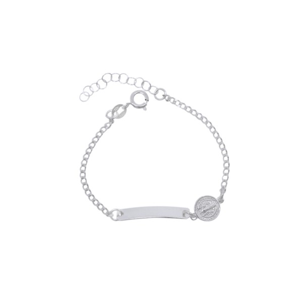 Esta delicada esclava para bebé en plata ley 925 combina diseño y significado en una joya pensada para proteger y acompañar desde los primeros momentos. Incorpora una medalla de San Benito, símbolo de fe y protección, junto a una placa rectangular lisa, ideal para grabar el nombre y convertirla en un recuerdo único y especial. Su acabado suave la hace cómoda y perfecta para uso diario o como regalo inolvidable.