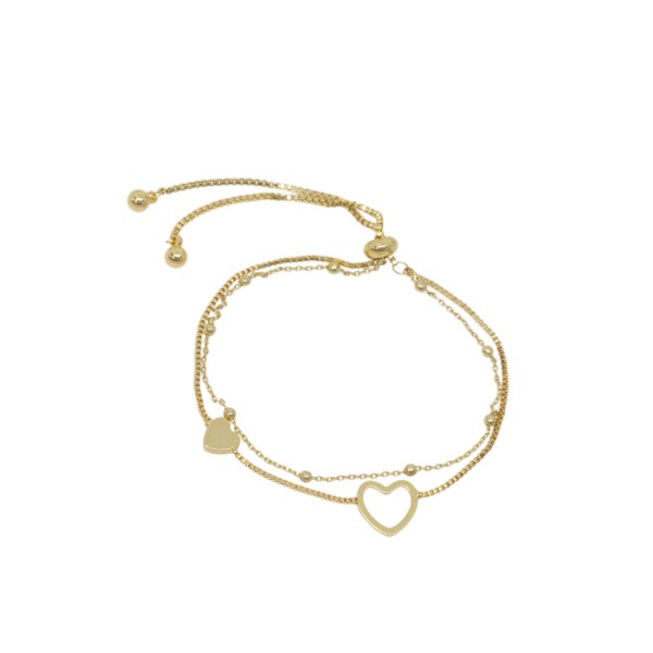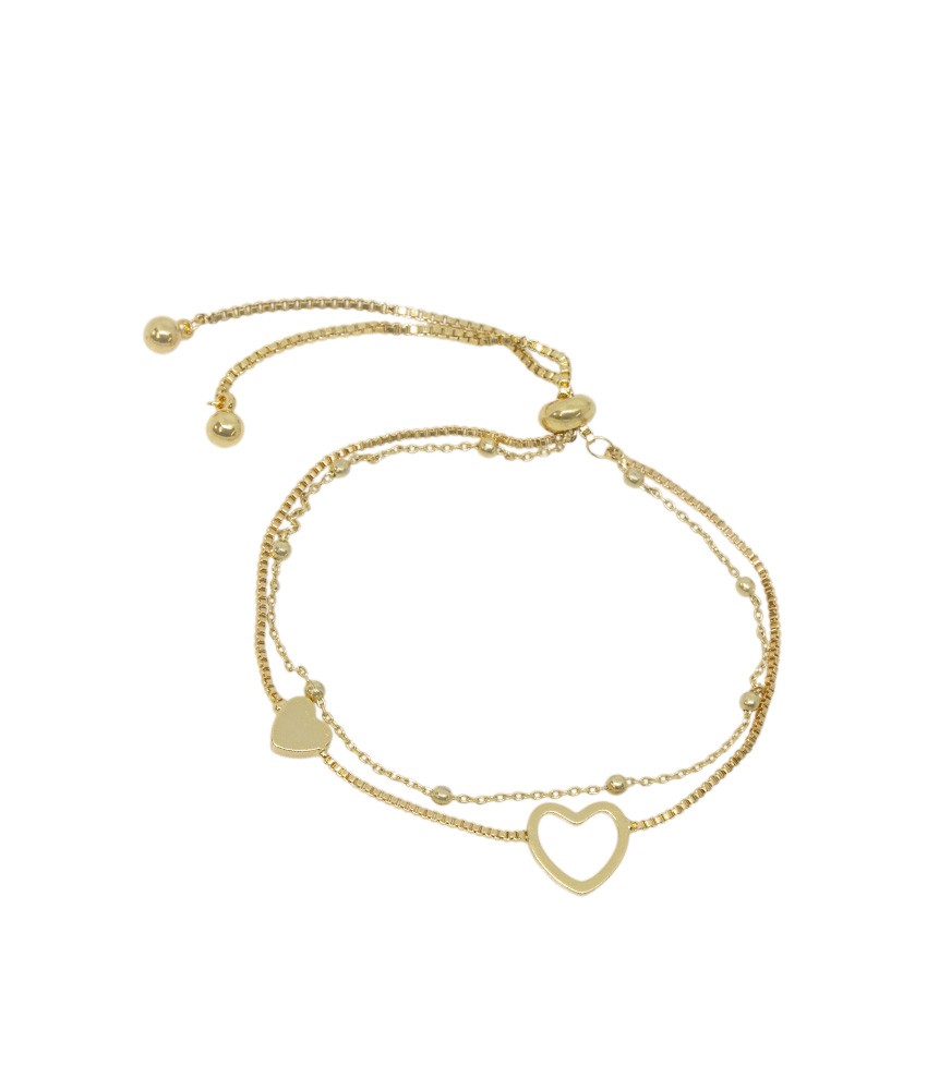 Esta pulsera ajustable elaborada en bronce combina delicados corazones y bolitas que aportan brillo y movimiento a tu look. Su diseño moderno y femenino la convierte en el accesorio ideal para usar a diario o para regalar un detalle lleno de amor y estilo.