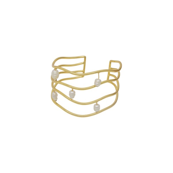 Brazalete de diseño calado con perlas, elaborado en bronce, que combina elegancia y delicadeza. Sus detalles calados y las perlas integradas aportan un estilo sofisticado y versátil, ideal para complementar cualquier look, desde casual hasta más formal. Una pieza que resalta por su diseño único y refinado.
