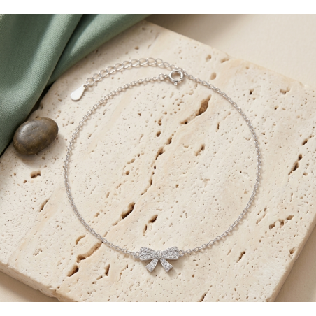 Feminidad y estilo en cada paso. Esta tobillera en plata 925 presenta un delicado moño adornado con circones brillantes, que aporta un toque de sofisticación y encanto. Su diseño elegante y versátil la convierte en el complemento perfecto para lucir con cualquier look, ya sea casual o más formal, añadiendo un detalle sutil y brillante que marca la diferencia.