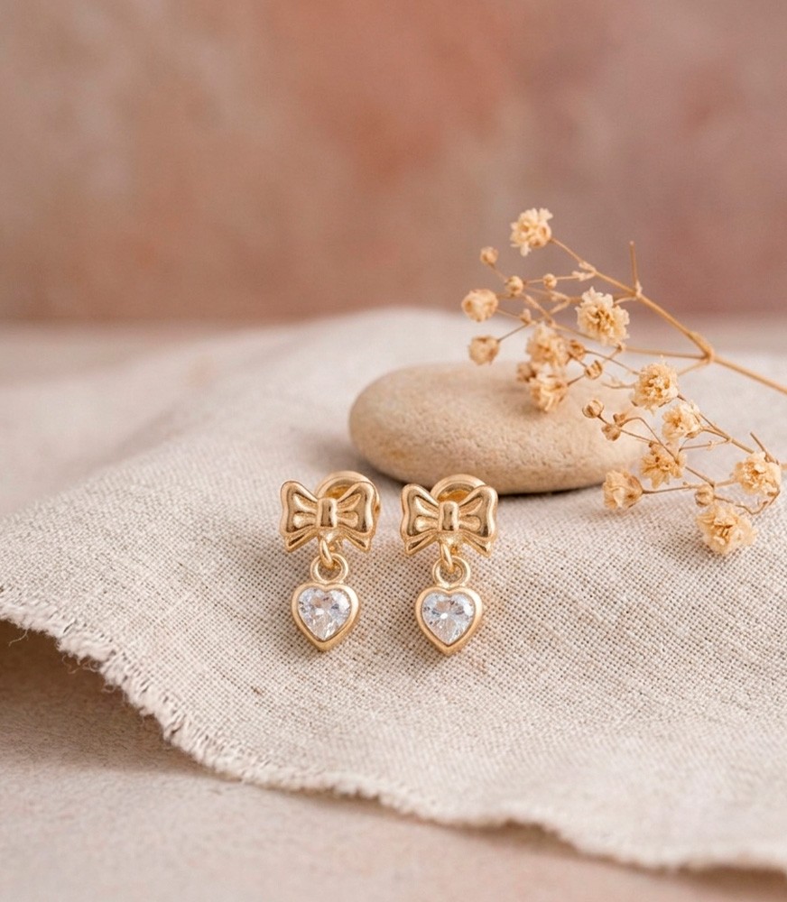 Topos pequeños en oro de 18 quilates. Diseño novedoso colgante elaborado en oro amarillo, con forma de moño del cual cuelga una pequeña piedra circón engastada en bisel con forma de corazón, cuentan con sistema de cierre en rosca.